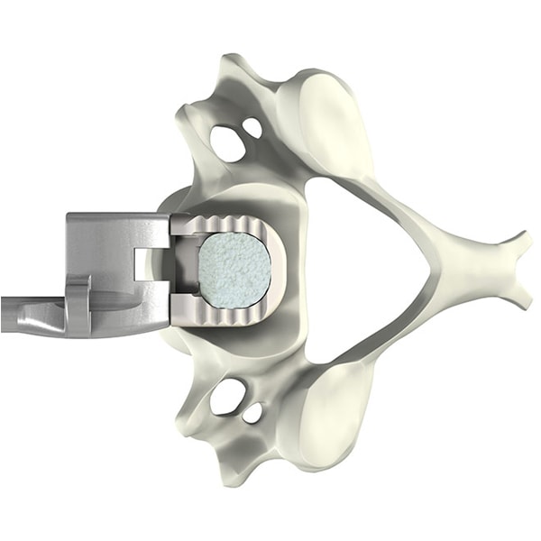 - El anclaje es autoguiado mediante el soporte del implante de acuerdo con su orientación angular (30° en relación a los platillos vertebrales) y también en profundidad para asegurar una colocación perfecta (impactador con tope)