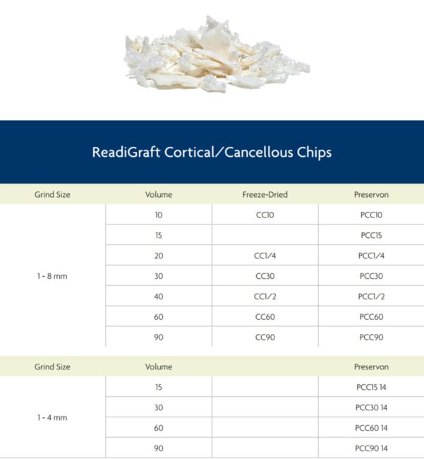 Una mezcla natural de chips de hueso cortical y esponjoso diseñados para fomentar la remodelación bifásica en presentaciones de: 5cc, 10cc, 15cc y 30cc.